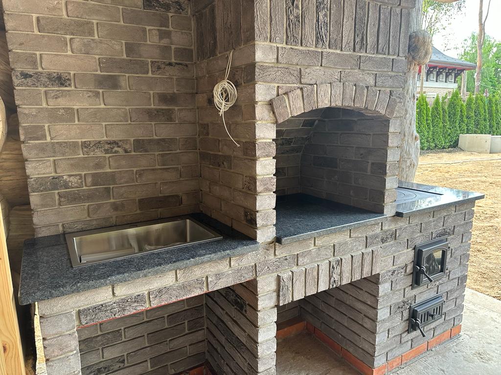 Облицовка выполняется из натурального камня — известняка, травертина или гранита. Природа создала огромное разнообразие сортов и цветов камня. И в умелых руках натуральный камень превращается в изюминку интерьера. Мы предлагаем комплексы барбекю по индивидуальным проектам, подходящие именно Вам и к дизайну вашего дома или участка. Вы можете стать соавтором вашего барбекю-комплекса или беседки.